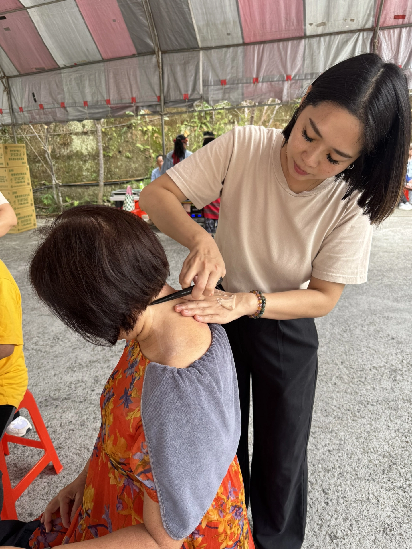 在活動現場,我們的撥經師一一為長輩與居民進行舒筋調理。透過牛角撥經的自然手法,幫助放鬆肩頸、舒緩疲勞。看著原本緊繃的表情慢慢轉為笑容,那一刻,我們明白:「健康」不只是身體的狀態,更是一種被關心的感覺。