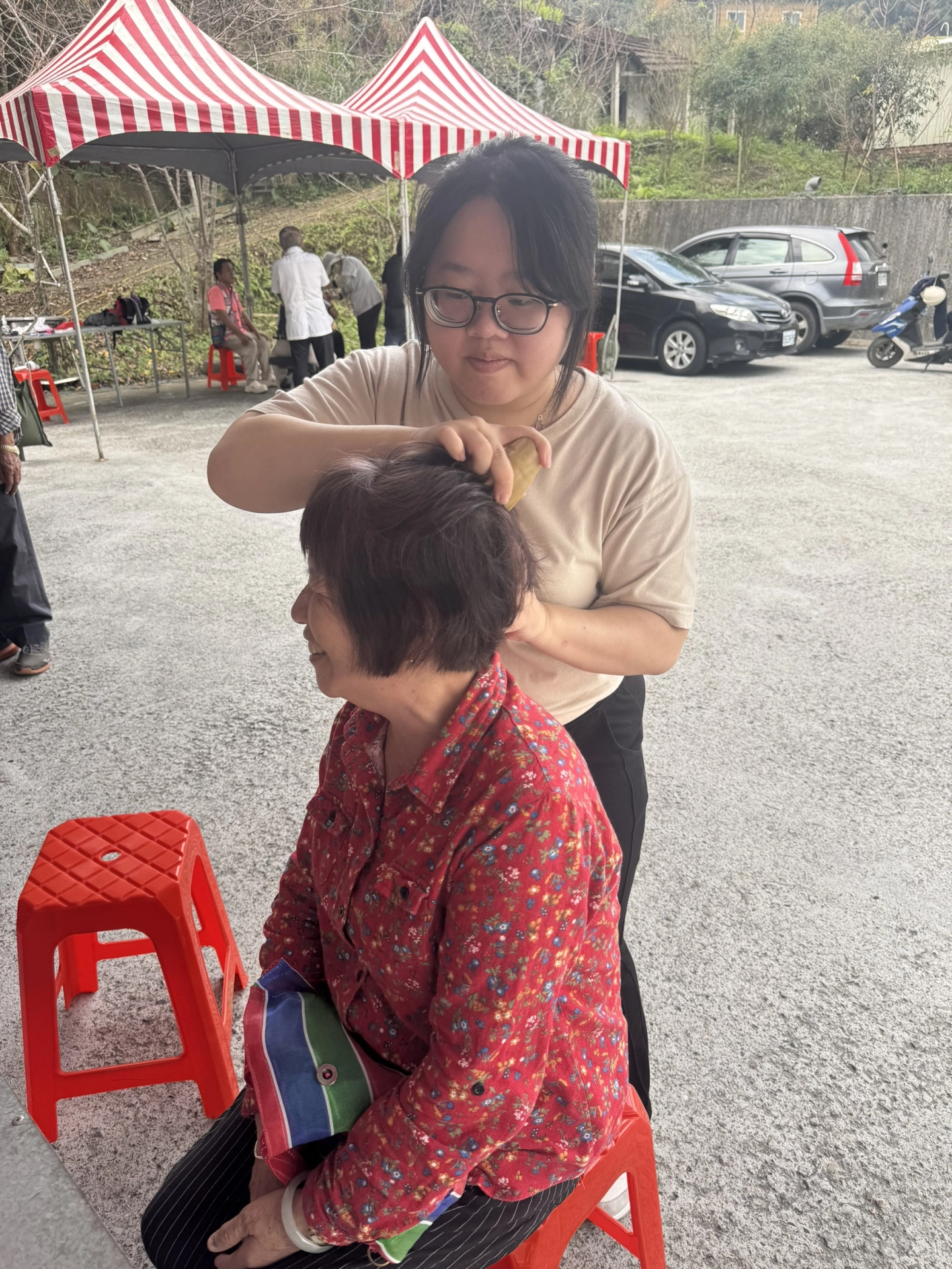 在活動現場,我們的撥經師一一為長輩與居民進行舒筋調理。透過牛角撥經的自然手法,幫助放鬆肩頸、舒緩疲勞。看著原本緊繃的表情慢慢轉為笑容,那一刻,我們明白:「健康」不只是身體的狀態,更是一種被關心的感覺。